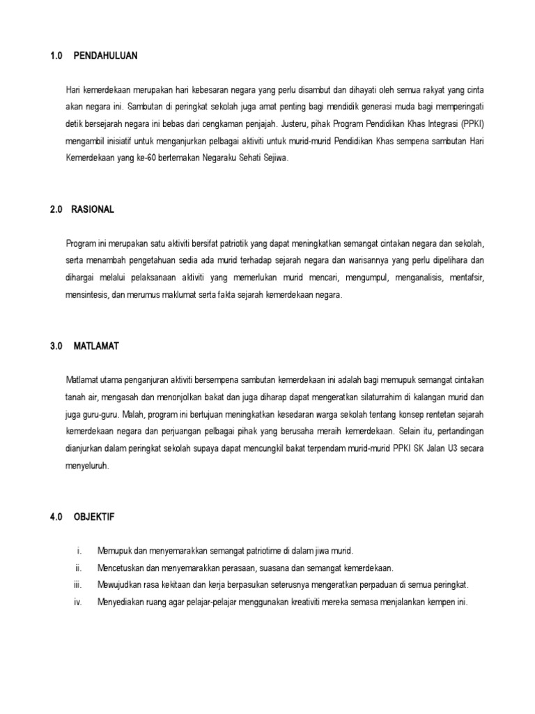 Sekolah menengah kebangsaan pandan mewah ampang selangor kertas kerja sambutan bulan kemerdekaan tahun 2016 anjuran. Contoh kertas kerja sambutan hari kemerdekaan pendidikan khas sekolah rendah. KERTAS KERJA SAMBUTAN BULAN KEMERDEKAAN PERINGKAT SEKOLAH 2018 1.